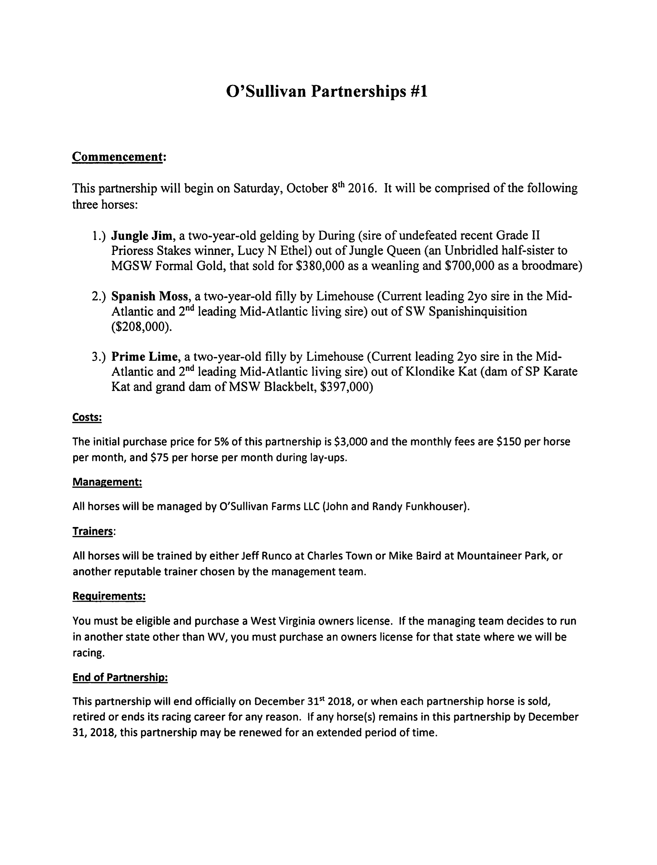 O’Sullivan Farms is offering partnership opportunities from the cream of the crops. The select partnerships will range from approximately 2-15 partners depending on the horse or horses and the joint interests of the partners.